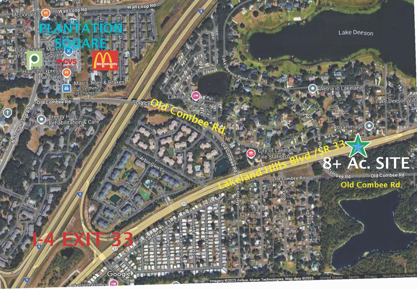 Located at the signalized intersection of SR 33 and Old Combee Rd., within one-half mile of I-4/Exit 33, and within one mile of Plantation Square with Publix, CVS, McDonalds and other retailers/restaurants. Site is within growth market of northeast Lakeland and within the City Limits.