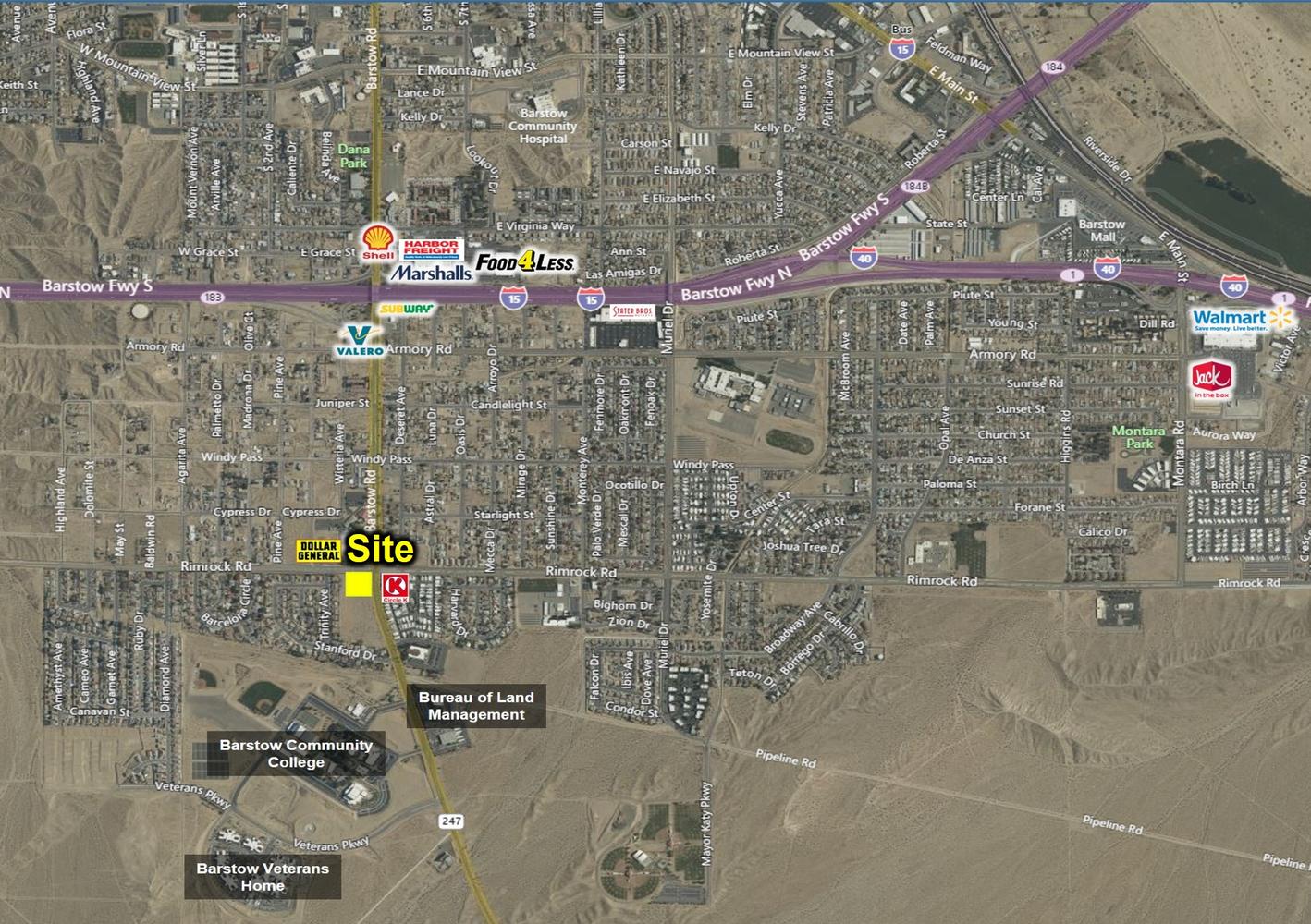 This property is located at the four-way signalized corner of Rimrock Rd & Barstow Rd., which are two major thoroughfares in Barstow. Located near Barstow Community College. Minutes from I-15 and I-40, this property lies in a community poised for tremendous growth with BNSF Railway’s proposed $4B Barstow International Gateway (BIG)—a ±4,500-acre logistics and intermodal facility projected to create 20,000+ jobs and millions of square feet of industrial development. Buyer to verify all information, including square footage, zoning, and permitted uses with the City of Barstow.