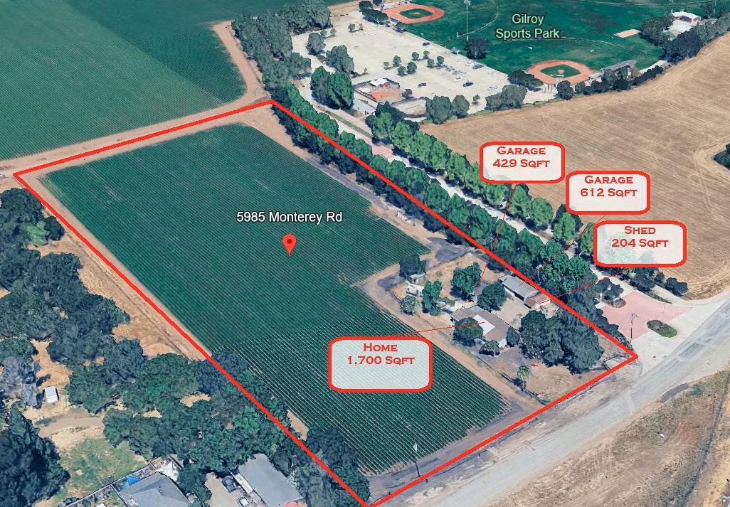 The property currently features 1 single family home with multiple out buildings and agricultural land. Home - 3 Bedroom 2 Bath Single Story. Prime Hwy 101 location adjacent to the Gilroy Sports Park.