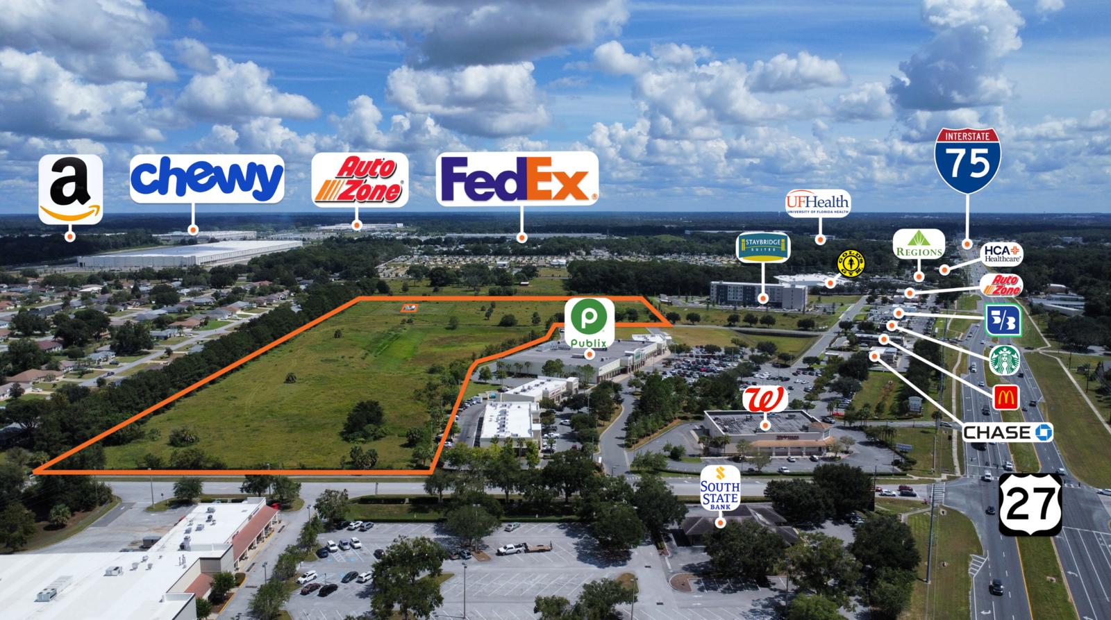 25+/- commercial acres next to Publix on Hwy 27 within the city of Ocala, FL, featuring water and sewer available to the property. The property's future land use is Low Intensity, which provides zoning for a wide variety of uses (B-2, B-4, M-1, PD), including retail, office, self-storage, mini-warehouses, and other types of commercial businesses. The current zoning is R-3, providing up to 18 residential units per acre for a total of 396 multifamily units. The estimated rezoning timeline is four months. This offering includes two parcels totaling 25.67 acres (22.03 and 3.64 acres). The 3.64 acres provides drainage retention with shared capacity for the Publix and the remaining 22.03 acres. Major employers and retailers nearby include: Chewy, FedEx, Amazon, AutoZone, UF Shands Hospital, HCA Emergency Care, Publix, Starbucks, Chase Bank, Regions Bank, Walgreens, McDonald's, Gold's Gym, and AutoZone. I-75 is a three-minute drive east, and the billion-dollar World Equestrian Center is a 12-minute drive west. The new Buc-ees and I-75 interchange will be a short five-minute drive. Marion County owns a .05+/- acre well, with a 100' circumference protection buffer located in the NE portion of the property.