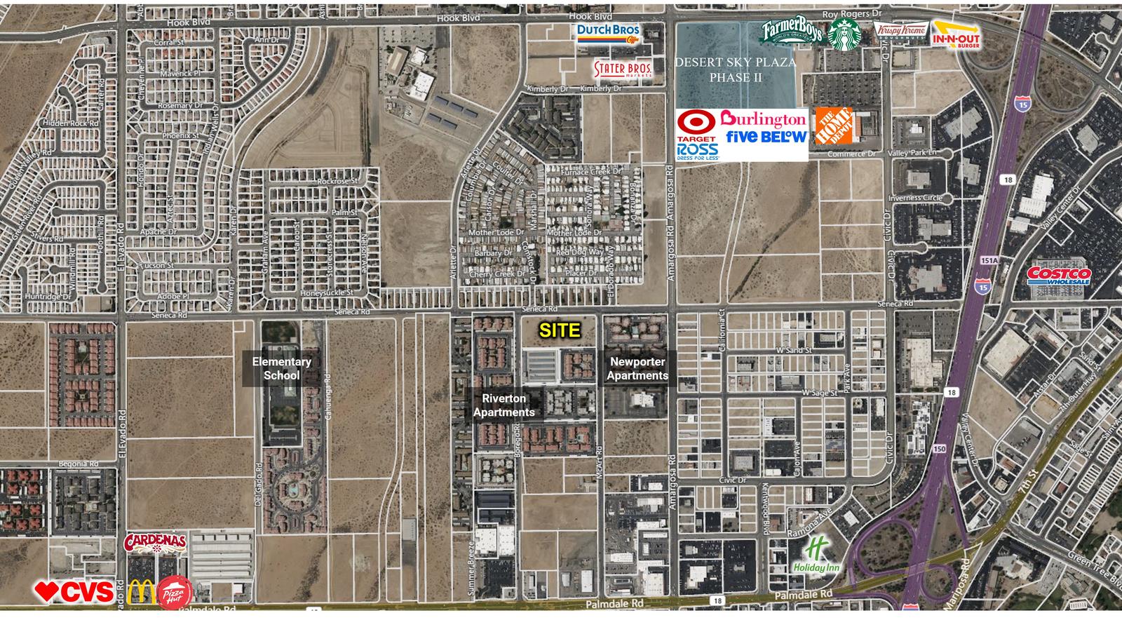 ±4.5 acres of unimproved multifamily land for sale on Seneca Rd in Victorville (APN: 0396-013-13). Zoned Civic Commons under the Civic Center Specific Plan, allowing for up to 30 dwelling units per acre. Excellent development opportunity located less than a mile from Interstate 15 and Highway 18. Nearby major retailers include Desert Sky Plaza, Stater Bros, Costco, and Cardenas Markets, along with numerous restaurants, schools, and shopping centers. The property sits just west of Amargosa Rd, between the Newport Apartments and Riverton of the High Desert Apartments. Buyer to verify all information.