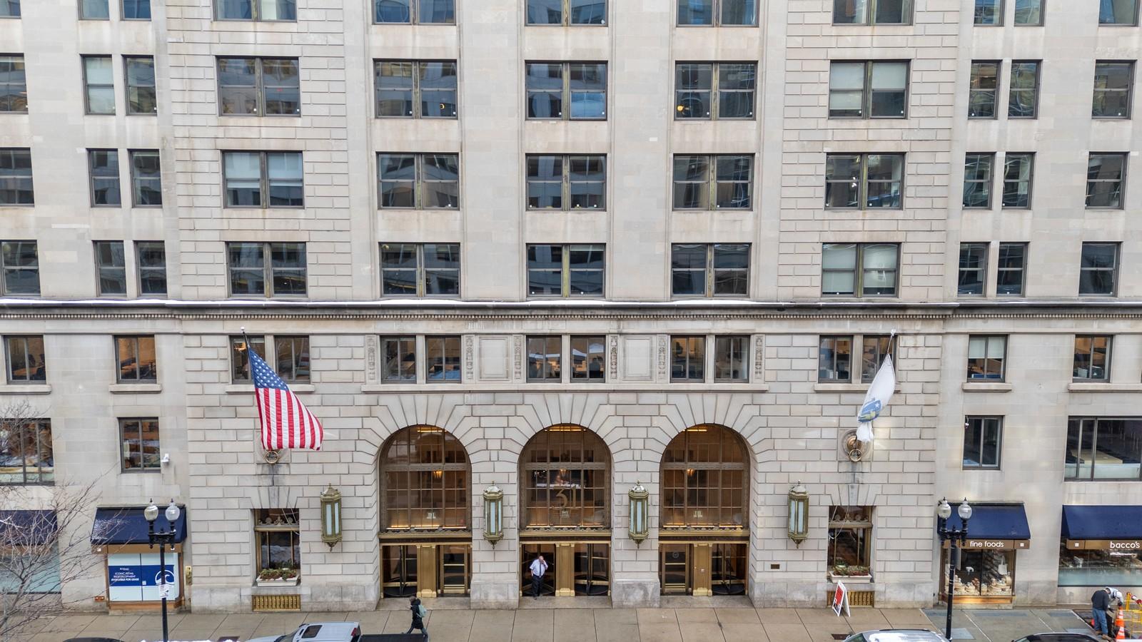 Reported amenities include 24-hour access, controlled entry, on-site management, conferencing facilities, restaurant and convenience retail components, security systems, elevator banks, and nearby parking. Public records further note sprinkler systems and vertical transportation infrastructure.