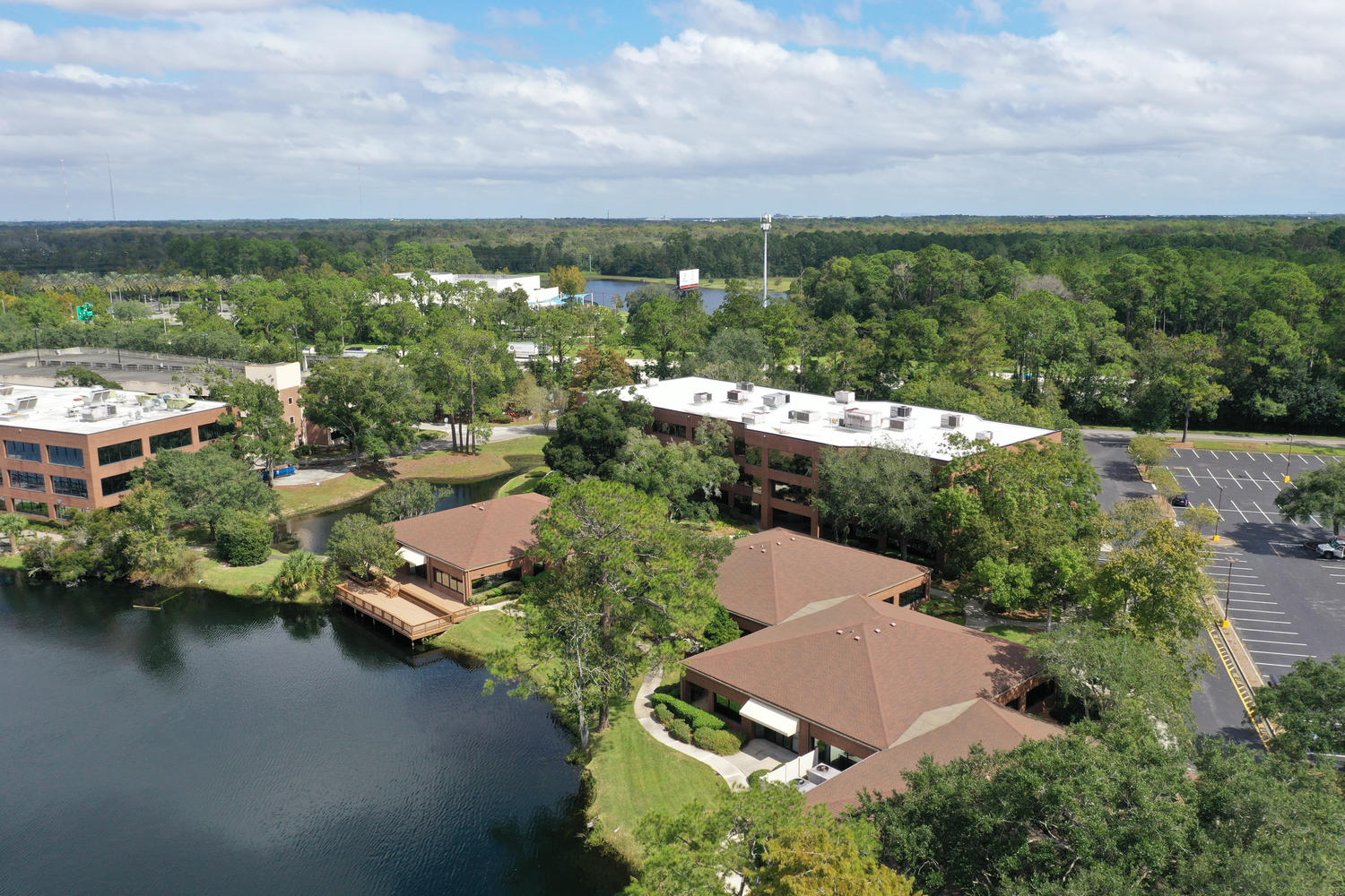 Lakeside Plaza’s lakefront setting offers unique outdoor amenities, including landscaped grounds, a gazebo, and deck areas overlooking the water creating an inviting environment for employees and clients alike.