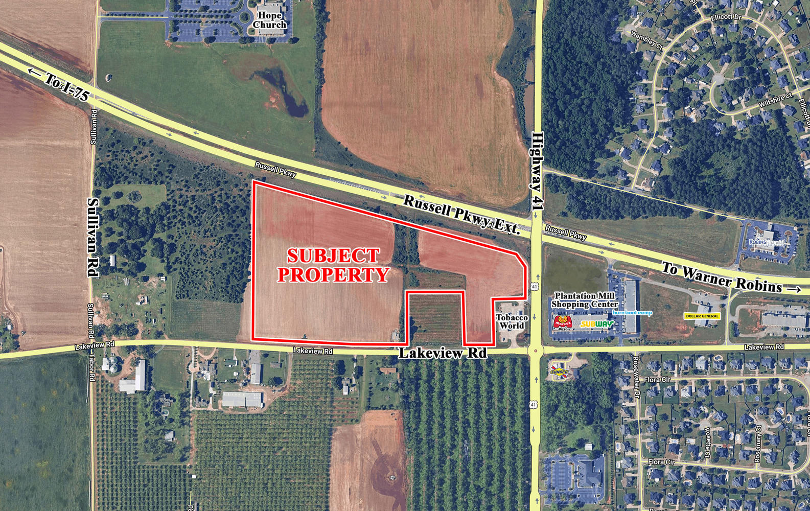 Parcel is situated at the corner of Russell Parkway Extension and Highway 41, just 1.3 miles from I-75. Businesses in the area include Buc-ee’s, Plantation Mill Shopping Center (54,302 SF retail center), Dollar General Robins Financial Credit Union, Buzzell Plumbing, Heating, & Air, Flint Electrical Membership Corporation, Pratt Industries, and Groome Transportation, as well as other retail and restaurant establishments.